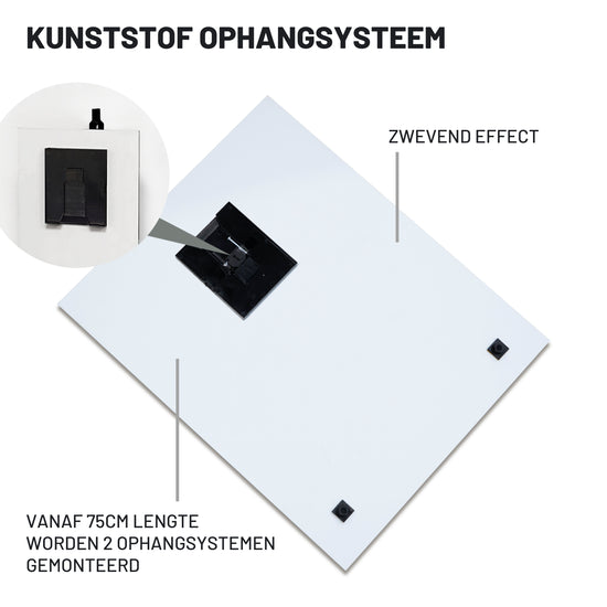 Dit ophangsysteem heeft een kleefstrip met 2 bijpassende kapjes. De afstand van de plaat tot de muur is 1,5 cm. Hierdoor krijgt de foto een zwevend effect.