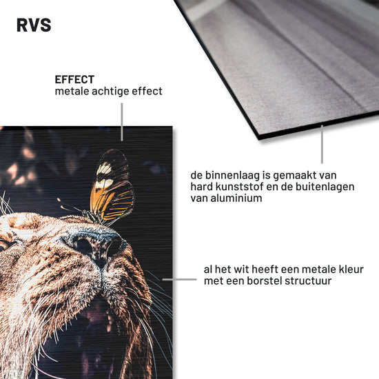 RVS wordt digitaal geprint met hoge kwaliteit UV Fine- Art inkten. De platen hebben een dikte van 3 mm en bestaan uit drie massieve lagen. De binnenlaag bestaat uit hard kunststof en de buitenlagen uit aluminium. Het oppervlak van geborsteld aluminium geeft het motief een reflectievrije matte afwerking en een opvallend speciaal effect. De heldere en witte delen van de afbeelding hebben namelijk een metaal-zilveren glans, waardoor het beeld tot leven komt. Het composietmateriaal RVS garandeert zowel duurzaamheid als stabiliteit. Door het ophangsysteem aan de achterkant lijkt het alsof het schilderij voor de muur zweeft. Dit geeft een prachtig effect. Een Wandkraft van RVS is een aanwinst voor iedere ruimte.