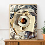 De kracht van Chapters & Coffee ligt in zijn subtiele compositie. De zachte kleurtonen – crème, koffiebruin, oud papier en lichtschaduw – brengen een gevoel van geborgenheid. Het warme licht nodigt uit tot vertragen. En de details, van de rimpels in het laken tot het porselein van het kopje, zorgen voor een verrassende diepte.