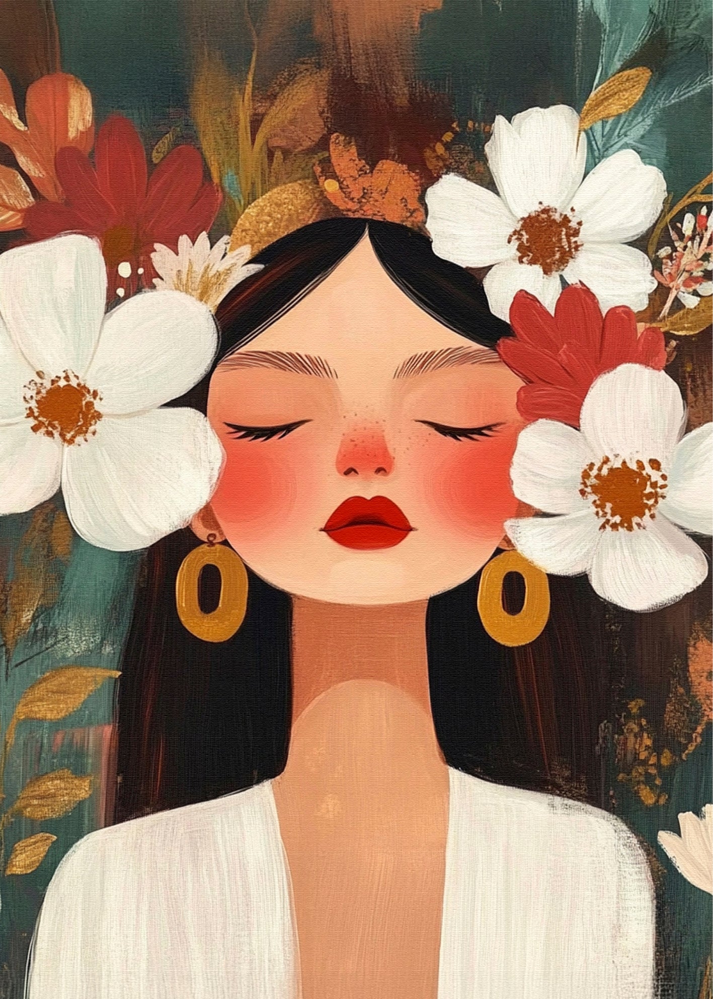 Serenity in Bloom vangt precies dat ene moment waarop alles klopt. Een vrouw met gesloten ogen, midden in een bloemrijke compositie. Ze straalt rust uit, maar ook kracht. Haar rode lippen, gouden oorbellen en de witte bloemen die haar omringen vormen samen een harmonieus beeld dat zowel zacht als krachtig aanvoelt.