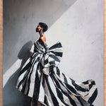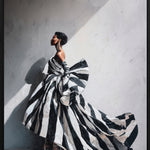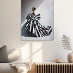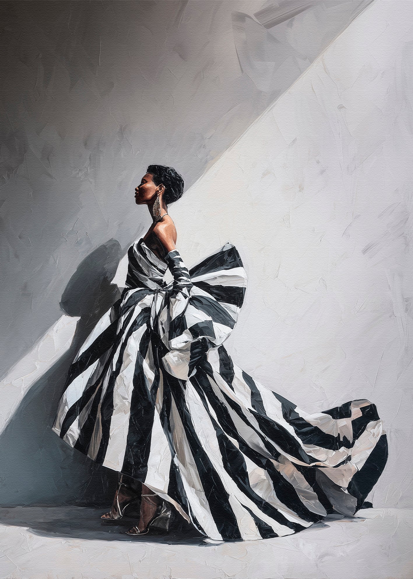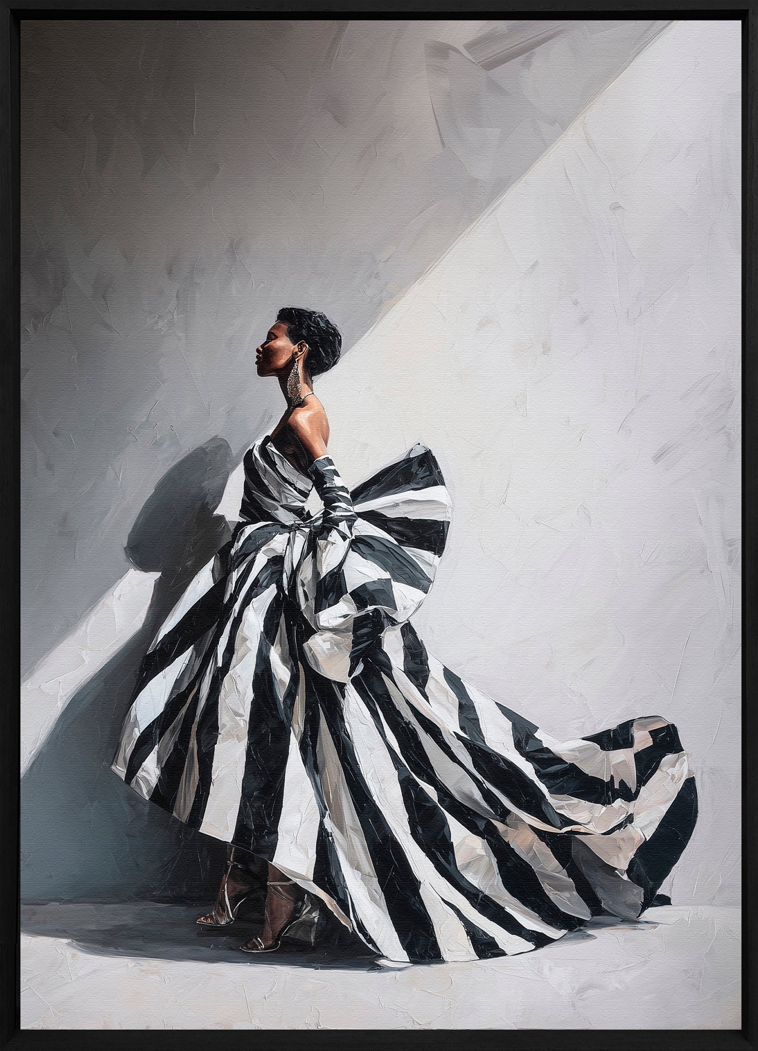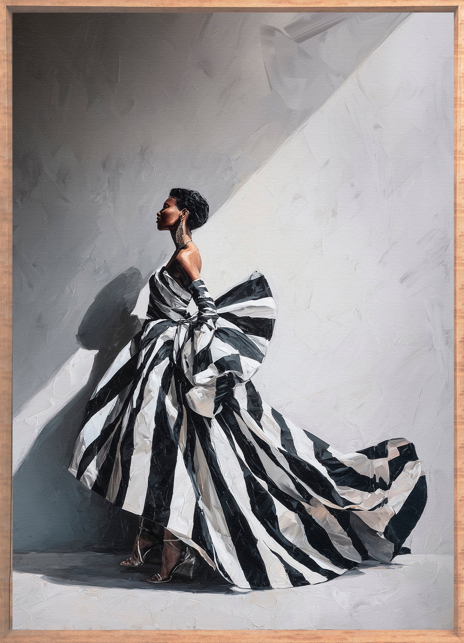 Striped Thoughts is niet zomaar een kunstwerk. Het is een krachtig beeld dat beweging, mode en karakter samenbrengt in één indrukwekkende compositie. De dramatische zwart-witstrepen van de jurk vangen het licht op een manier die je aandacht direct vasthoudt. Elegant en krachtig tegelijk, straalt dit werk pure moderne luxe uit — precies zoals jij het wilt zien in je interieur.
