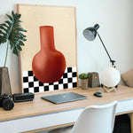 Terracotta Stillness vangt de essentie van moderne eenvoud. Het beeld toont een robuuste vaas in warme terracottakleuren, zorgvuldig geplaatst op een speels zwart-wit schaakbordpatroon. Deze grafische combinatie creëert een intrigerend spanningsveld tussen strak design en zachte, organische rondingen. Perfect in balans. Net als jij het in je interieur graag ziet.